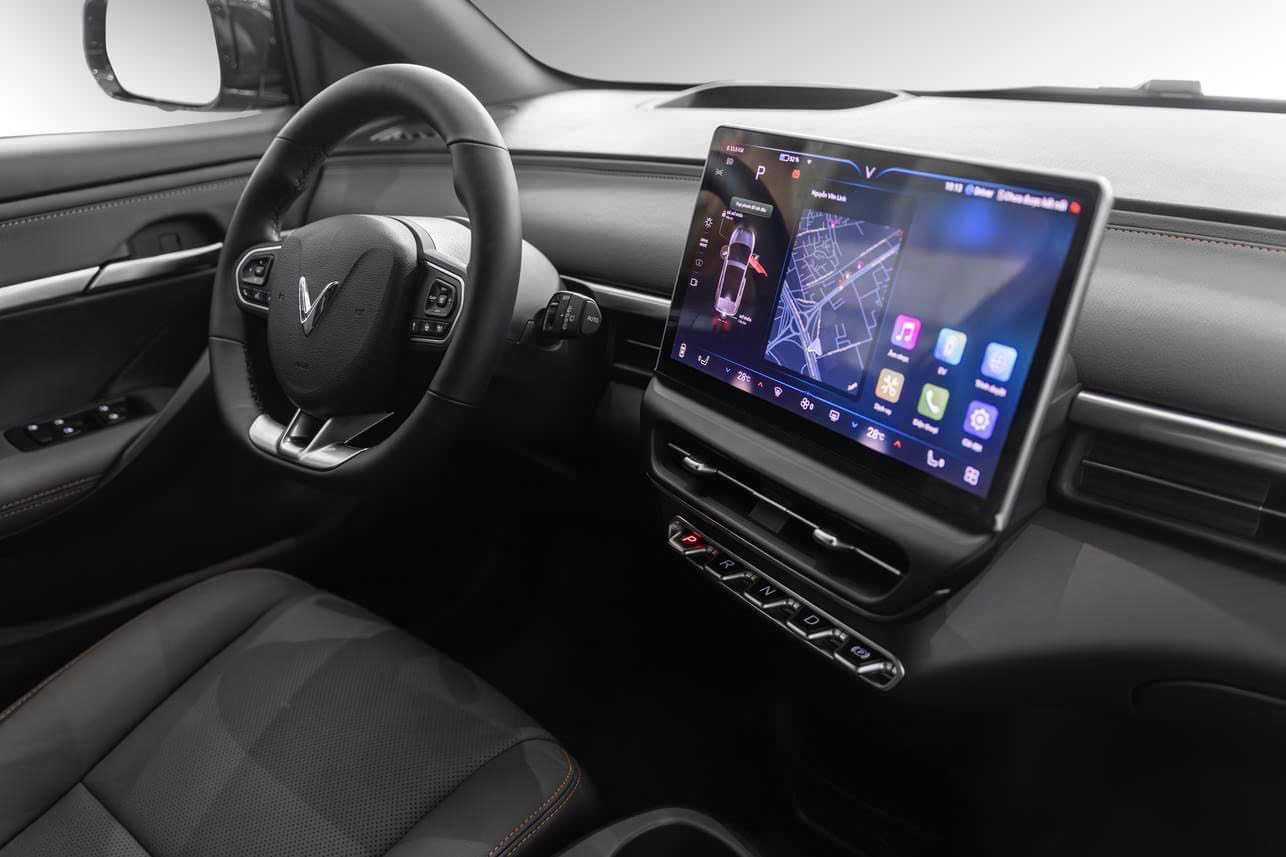 - Thiết kế: Nội thất của VF6 được thiết kế theo phong cách tối giản nhưng vẫn đảm bảo tính tiện nghi. Ghế ngồi bọc giả da cao cấp, màn hình cảm ứng trung tâm kích thước lớn 12,9 inch hỗ trợ Apple CarPlay/Android Auto.